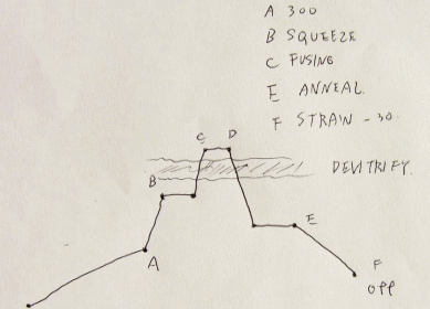 A 室温から300度付近まで B 泡切り点 C フュージング温度帯 斜線 失透帯 E 徐冷点 F 歪点 |