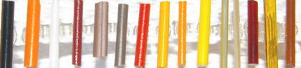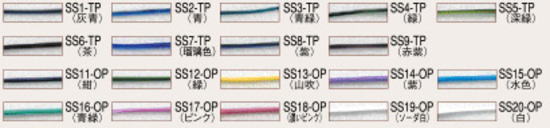 ![]() 上記特色ガラスを0.5mm〜1mm程度に伸ばした色サンプルで、上(SS1)から順に並んでいます |